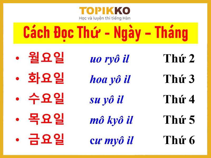 Cách đọc các ngày thứ tiếng Hàn